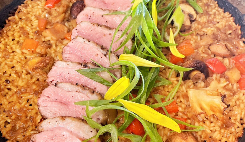 鴨の旨みときのこの香ばしさが重なる、味わい豊かなパエリア。(2人前~)